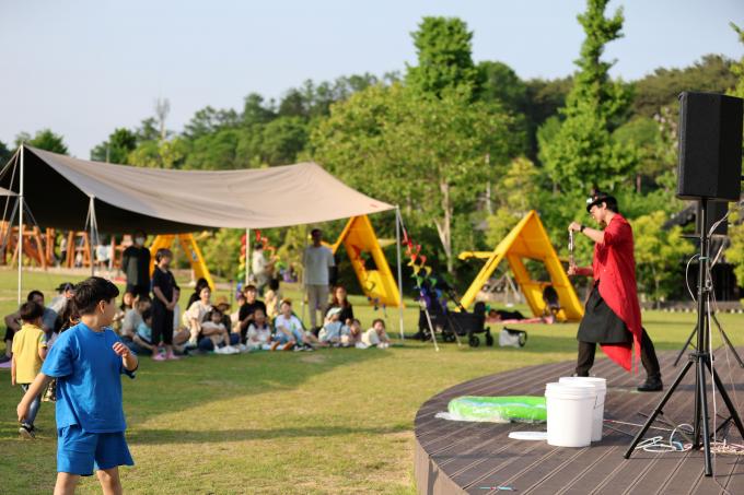 ▲19일 장성 황룡강 홍길동무 꽃길축제가 열린 홍길동 테마파크 마술쇼에 지나가던 아이가 걸음을 멈췄다. [장성군 제공]