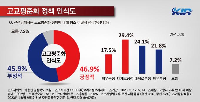 22일 박용선 경북도의원이 여론조사 전문기관인 코리아정보리서치에 의뢰해 조사한 '포항시 고교평준화 인식도 여론조사' 결과에 따르면 '긍정' 46.9%, '부정' 45.9%, '모름' 7.2%로 조사됐다.