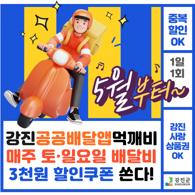 강진군은 먹깨비에서 매주 토·일요일 1만5000원 이상 주문 시, 배달비 3000원 할인쿠폰을 제공하는 이벤트를 하고 있다.