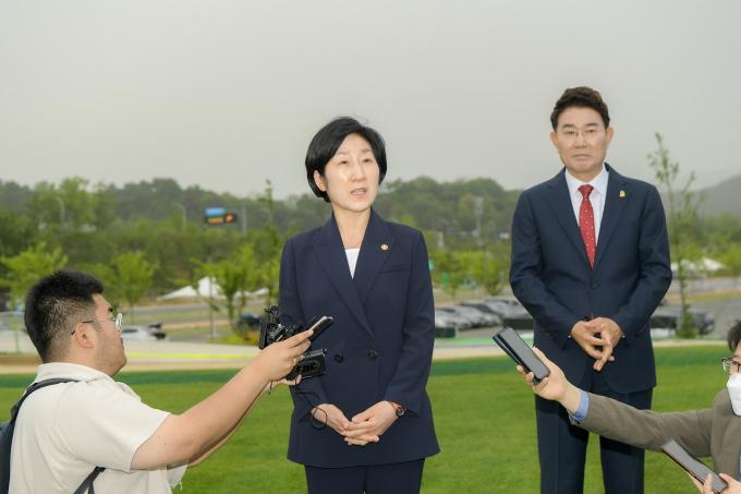 한 장관은 이날 '2023 생물다양성의 날' 행사 참석에 앞서 순천만국제정원박람회 그린아일랜드를 방문한 자리에서 대통령이 직접 지시한 동천 하천 사업은 얼마나 진행되고 있느냐는 기자 질문에 "빠르면 올해 말로 (승격될 것으로) 본다"고 말했다.
