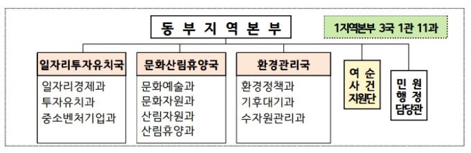 동부지역본부는 기존 1국 6과 154명 규모에서 1본부 3국 1관 11과 320명(공무원 259명·공무직 등 61명) 규모로 확대된다. 전체공무원 정원수 대비 22%가 동부본부에 배치된다.