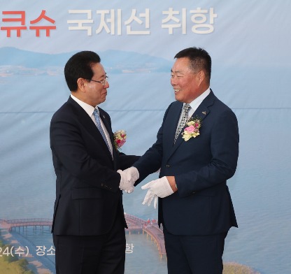 ▲24일 김영록 전남지사와 김산 무안군수가 하이에어 항공의 무안-기타쿠슈 국제선 취항식에서 테이프 컷팅식을 가진 뒤 악수를 하고 있다. [무안군 제공]