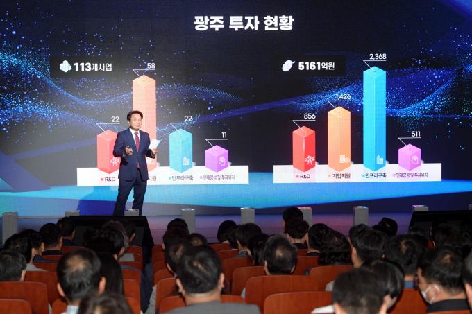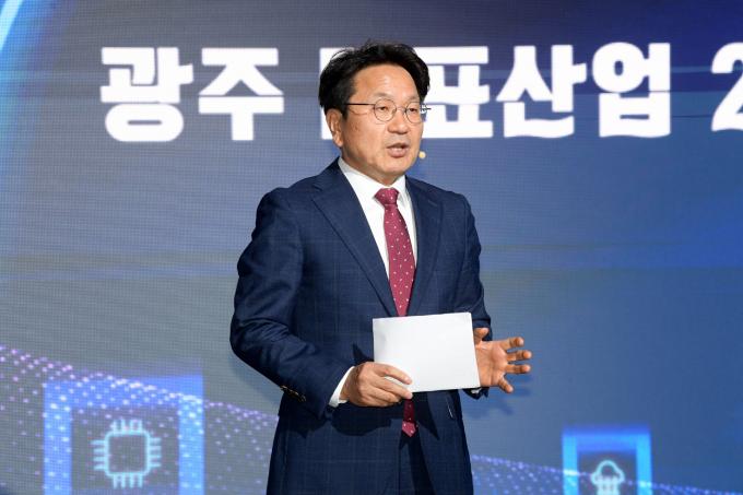 ▲강기정 광주광역시장이 24일 광주이노비즈센터에서 열린 '광주 대표산업 2030 비전보고회'에 참석해 비전보고를 하고 있다. [광주광역시 제공]