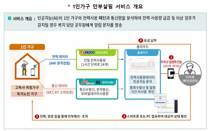 '1인 가구 안부살핌 서비스'는 원격검침계량기를 통해 전력과 데이터 사용량 등을 분석해 생활 패턴을 파악한 뒤, 이상 상황이 감지되면 AI가 자동으로 전화를 걸어 안부를 확인하고 비상시 현장에 출동해 대상자의 안전을 확보하는 서비스다.