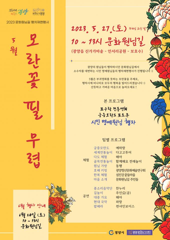이번 회차는 모란꽃 필 무렵이라는 부제로 진행되며, 오는 27일 토요일 오전 10시부터 오후 1시까지 광양읍 인서리 일원에서 개최된다.