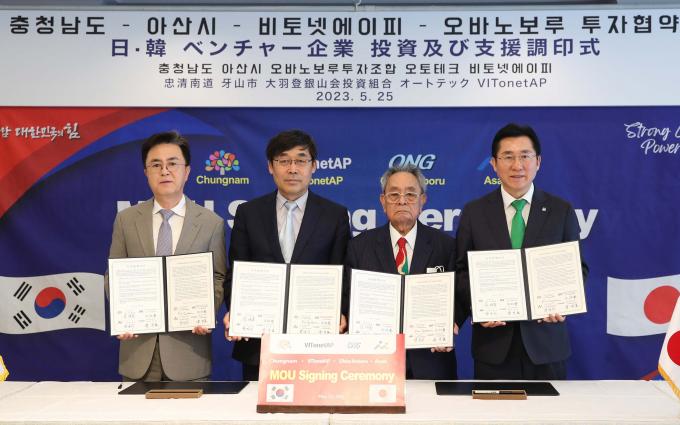 일본을 출장 중인 김태흠 지사는 25일 도쿄 뉴오타니 호텔에서 오바 노보루 긴잔카이 투자조합 오바 노보루 이사장, 윤영표 비토넷에이피 대표이사, 박경귀 아산시장과 투자양해각서(MOU)를 체결했다.