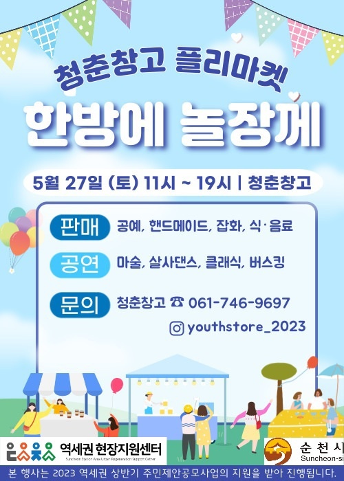 25일 순천시에 따르면 청춘창고 플리마켓 '한방에 놀장께'는 역세권 활성화와 주민 공동체 강화를 목적으로, 청춘창고를 활용해 침체된 지역 상권 분위기를 전환시키기 위해 추진한다.