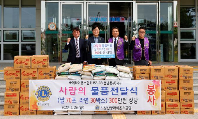 ▲26일 보성산양라이온스클럽 김재홍 회장과 보성군 김규옹(왼쪽 두번째) 부군수가 보성군청에서 쌀 10kg 70포와 라면 30박스 전달식을 진행한 뒤 기념촬영을 하고 있다. [보성군 제공]