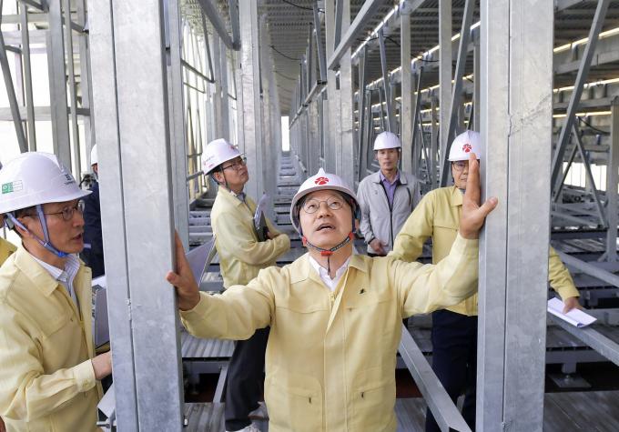 ▲강기정 광주광역시장이 30일 오전 서구 광주FC 전용축구장을 찾아 가변형 관람석을 안전점검하고 있다. [광주광역시 제공]