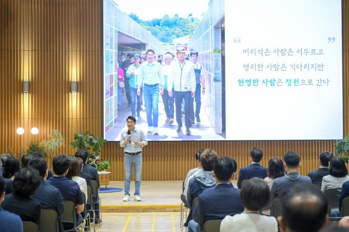 또 순천만에 월동하는 흑두루미가 폐사하지 않도록 전봇대를 뽑고, 도심팽창으로부터 순천만을 지킬 에코벨트로 2013순천만국제정원박람회를 기획·유치하면서 겪었던 우여곡절의 과정도 서울시 공무원 450명에게 공유했다.