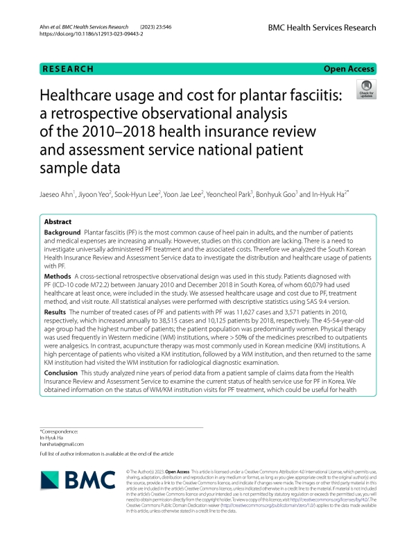 이에 자생한방병원 척추관절연구소(소장 하인혁) 안재서 한의사 연구팀은 2010부터 2018년까지의 건강보험심사평가원 자료를 기반으로 국내 족저근막염 환자의 의료이용 현황을 분석했다고 지난 7일 밝혔다. 해당 논문은 SCI(E)급 저널 'BMC Health Services Research (IF=2.908)' 5월호에 게재됐다.