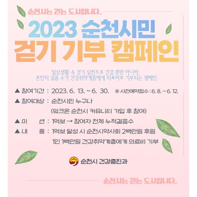 이번 캠페인은 순천시민의 건강 걸음수 1억 보가 의료 취약계층에게 의료비 200만 원으로 기부돼 암, 희귀난치성 질환자 등 건강 취약계층에게 삶의 희망이 되는 시민 걷기 운동으로 진행된다.