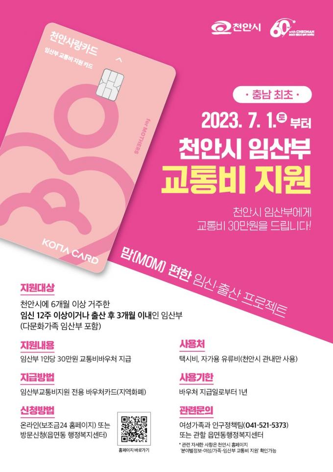 교통약자인 임산부들의 이동 편의를 제공하고 출산가정의 경제적 부담을 덜어주기 위해 충남 최초로 도입하는 '천안시 임산부 교통비 지원'은 전액 시비로 지급한다.