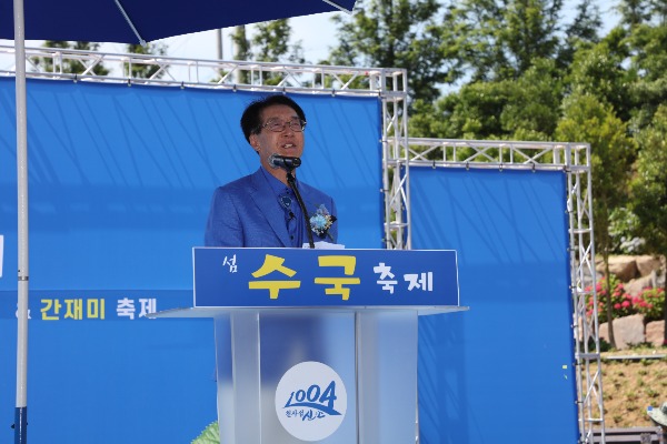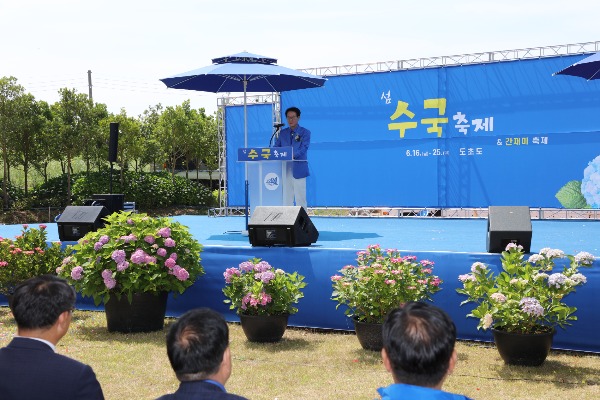 ▲지난 16일 박우량 신안군수가 도초도 수국정원에서 '섬 간재미 축제와 수국축제' 동시 개최를 알리는 개막식에 참석한 뒤 기념사를 하고 있다. [신안군 제공]
