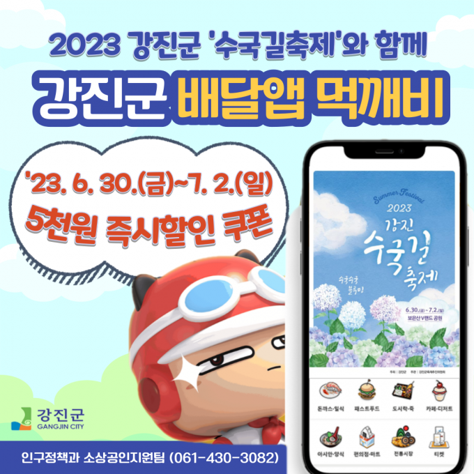 강진군은 오는 30일부터 다음달 2일까지 열리는 '강진군 수국길축제'와 연계해 '공공배달앱 먹깨비 5000원 즉시 할인' 이벤트를 실시한다고 21일 밝혔다.