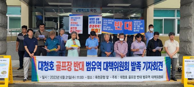 충청권 59개 시민사회환경단체가 참여한 대책위는 21일 옥천군청에서 기자회견을 갖고 "2012년 6월4일 충북도청 앞에서 대책위 발족 기자회견을 한 지11년 만에 우리는 다시 '대청호 골프장 반대 범유역 대책위원회'를 결성한다"며 "대전,세종,충북,충남의 유역을 포괄해 함께 대응한다"고 밝혔다.
