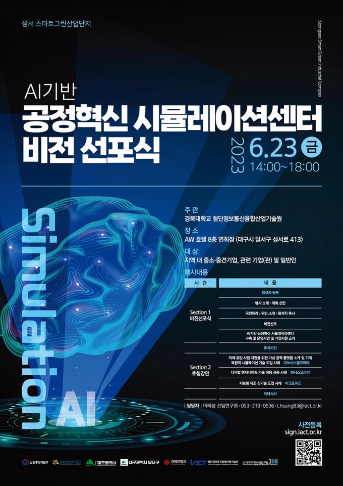 22일 시에 따르면 AI기반 공정혁신 시뮬레이션센터 비전 선포식은 '성서 스마트그린산업단지 디지털 혁신'이라는 비전 선포를 시작으로 사업소개, 기업지원 안내 및 시뮬레이션 기술 적용 사례와 효과에 대한 전문기업 초청강연이 진행된다.