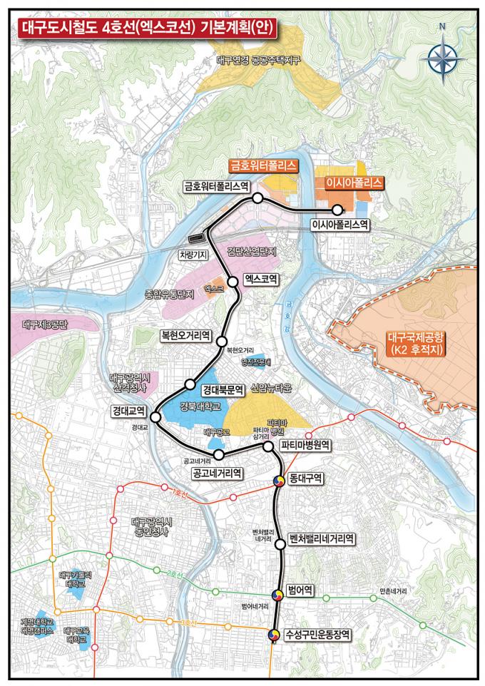 29일 시에 따르면 도시철도 4호선은 2018년 8월 예비타당성조사를 신청해 2020년 12월 예비타당성조사를 통과한 사업으로 2021년 5월 기본계획 수립 용역을 착수했고 올해 2~3월 공청회 및 주민설명회에서 제기된 요구에 대해서는 경대교역 추가, 엑스코역 위치 변경 등을 반영했다.