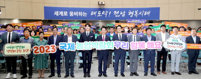 ▲김영록 전라남도지사가 3일 오후 도청 왕인실에서 2023국제농업박람회 D-100일을 기념해 가수 박지현 홍보대사 등 참석자들과 성공개최를 기원하는 퍼포먼스를 하고 있다. [전남도 제공]