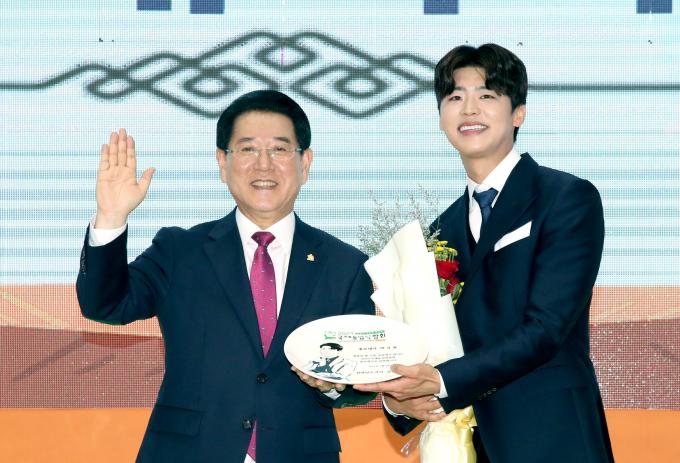 ▲ 김영록 전라남도지사가 3일 오후 도청 왕인실에서 2023국제농업박람회 성공개최 D-100일을 기념해 가수 박지현에게 홍보대사 위촉장을 수여하고 기념촬영을 하고 있다. [전남도 제공]