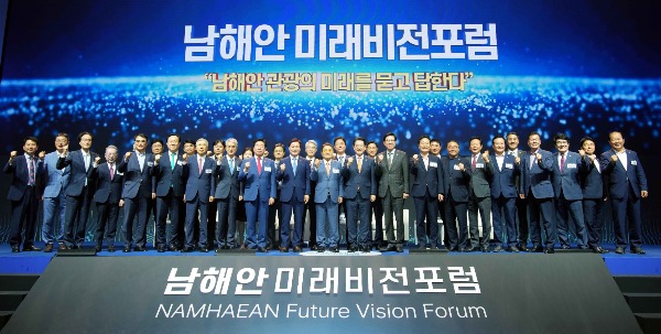 ▲김영록 전라남도지사가 4일 오후 창원컨벤션센터에서 개최된 '남해안 미래비전 포럼'에서 박완수 경남도지사, 박형준 부산광역시장 등 참석자들과 함께 남해안 해양레저관광벨트 활성화를 위한 세레모니를 하고 있다. [전남도 제공]