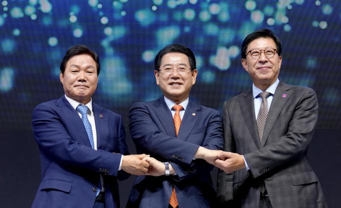 ▲김영록 전라남도지사가 4일 오후 창원컨벤션센터에서 개최된 '남해안 미래비전 포럼'에서 박완수 경남도지사, 박형준 부산광역시장과 대담을 마치고 손을 맞잡고 있다. [전남도 제공]