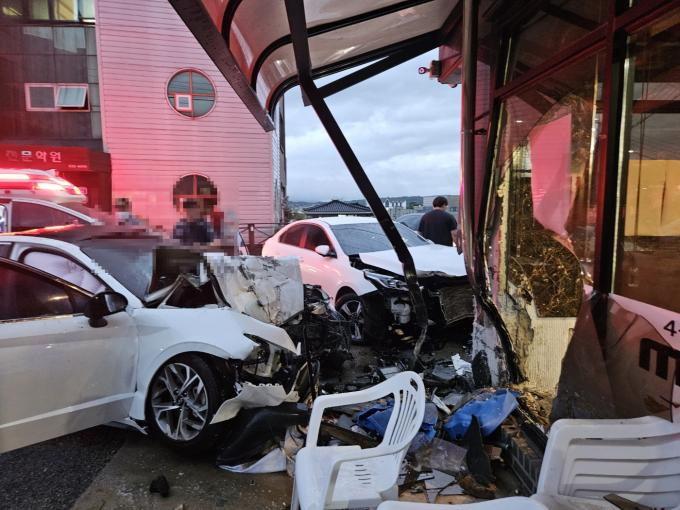 또 건물 외벽 일부가 부서지고 창문이 깨지는 등 피해가 났다. 식당 안에 있던 목격자는 "승용차가 갑자기 가게 기둥을 들이받았다"고 진술했다.