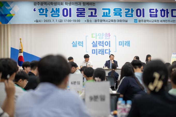 9일 광주시교육청에 따르면 이정선 교육감은 이날 초·중·고 학생의원 100명과 만나 광주교육 1년의 성과와 과제를 공유했다. 또 평소 학교와 광주교육에 대해 궁금한 점을 묻고 답하는 눈높이 소통의 자리를 만들었다.
