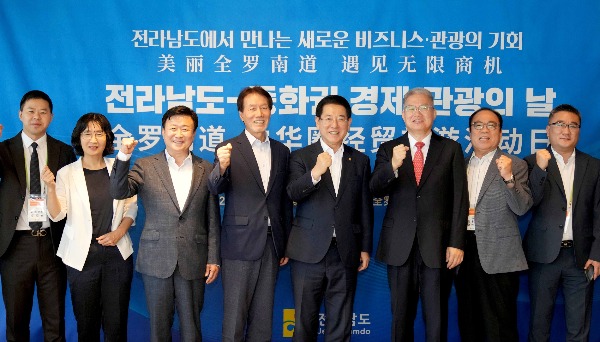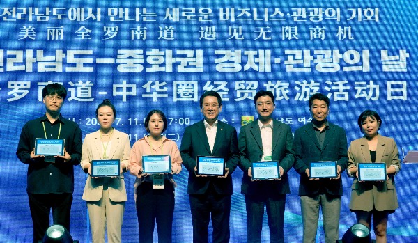 ▲김영록 전라남도지사가 11일 여수 소노캄호텔에서 개최된 전라남도-중화권 경제·관광의 날 행사에서 장청강 주광주중국총영사 등 중국 기업인들과 기념촬영을 하고 있다. [전남도 제공]