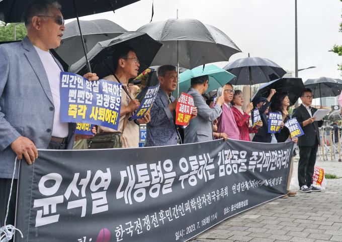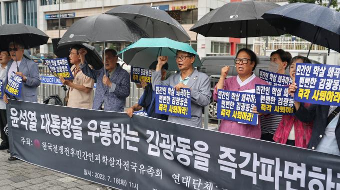 한국전쟁전후민간인피학살자전국유족회 외 국가폭력 피해자단체들과 시민단체들이 18일 오전 서울 용산 대통령실 앞에서 김광동 진실화해위원회 위원장의 파면을 촉구하는 기자회견을 열었다.