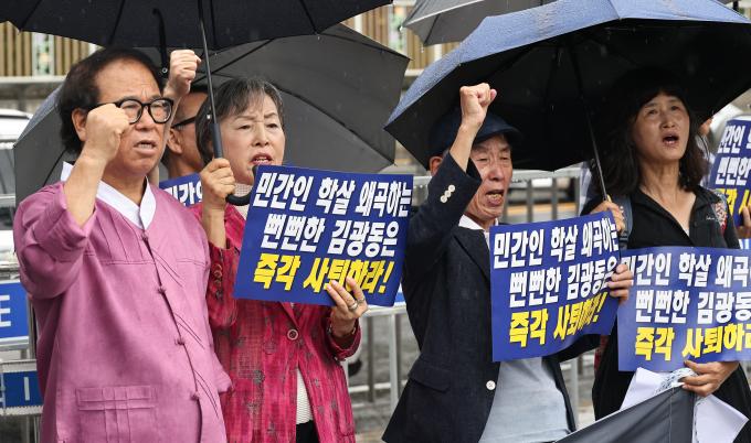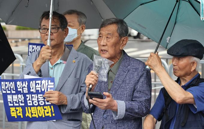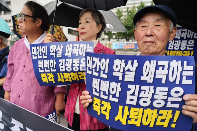 윤호상 한국전쟁전후민간인피학살자 전국유족회 상임대표의장은 "윤석열 정부는 틈만 나면 공정과 상식을 국정철학으로 내세우며 제주 4·3과 5·18항쟁추모사에서 유족의 아픔을 보듬어주고 밝은 미래로 나아가겠다고 약속했다"며 "추모사가 윤 대통령의 진심이라면 김광동의 행위는 대통령의 국정철학을 정면으로 반대하고 공격하는 윤 대통령을 향한 배신행위이며 김광동은 윤 대통령이 말씀하신 싸워야할 반국가세력의 첨병이라 생각한다"고 밝혔다.