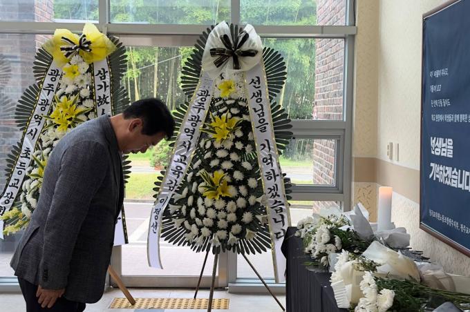 ▲이정선 광주시교육감이 23일 광주교육시민협치진흥원설립추진단에 마련된 서울 초등교사 추모공간을 찾아 고인의 명복을 빌었다. [광주시교육청 제공]