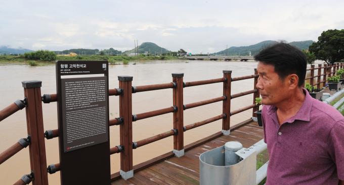 ▲24일 오전 집중 호우에 따른 범람 우려지역인 함평군 학교면 고막원천을 마을 주민이 걱정스런 표정으로 바라보고 있다. [전남도 제공]