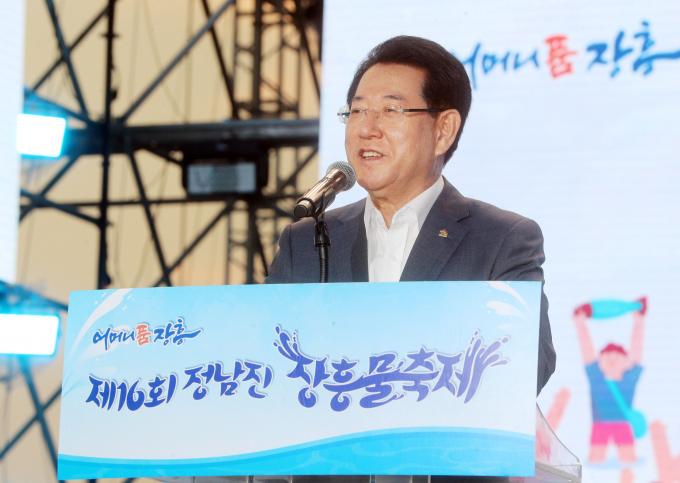 ▲김영록 전라남도지사가 지난 29일 오후 장흥군 장흥읍 탐진강변에서 열린 제16회 정남진 장흥 물축제에서 축사를 하고 있다.