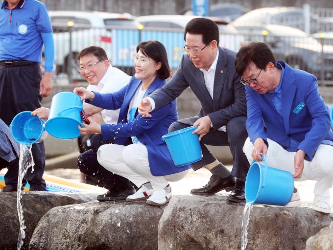 ▲김영록 전라남도지사와 김성 장흥군수 등 참석자들이 지난 29일 오후 장흥군 장흥읍 탐진강변에서 열린 제16회 정남진 장흥 물축제에서 연어를 방류하고 있다. [전남도 제공]