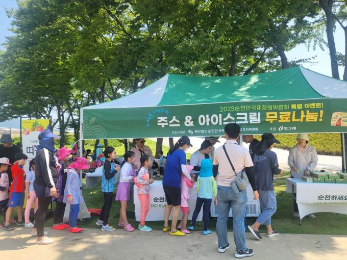 이날 제공한 아이스크림과 음료는 박람회 공식공급권자인 빙그레에서 후원한 것으로, 새롭게 출시된 따옴 아이스크림 1만6000개와 유기농 따옴 주스 8000개를 나눔했다.