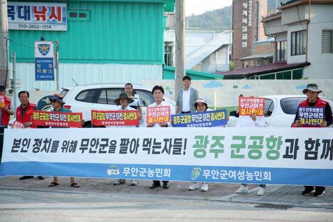 이날 김경현 무안군의회 의장, 무안군 농민회, 무안군 여성농민회, 청계면 이장협의회 등 40여 명은 목포대학교와 청계 파출소 앞에서 '광주 군공항 무안군 이전 반대' 거리 캠페인에 나섰다.