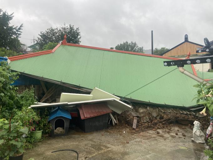 소방 당국은 태풍 카눈의 영향으로 주택 벽면 일부가 무너지면서 지붕이 내려 앉은 것으로 보고 정확한 사고 경위를 조사하고 있다.
