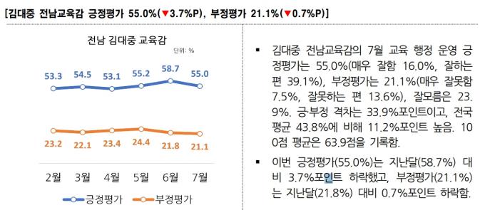 11일 여론조사 전문기관 리얼미터가 발표한 '2023년 7월 전국시도교육감 평가 조사' 결과 김대중 전남교육감은 55%의 긍정률을 보여 2위를 기록했다.