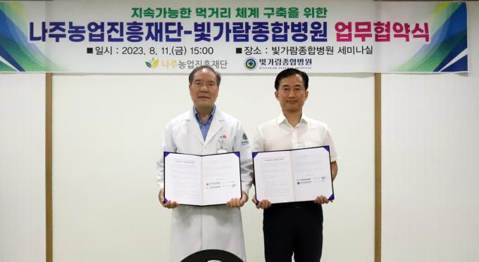 두 기관은 이번 협약을 통해 빛가람종합병원 구내식당에 나주로컬푸드 식재료를 공급하고, 재단에서는 임직원 건강검진 시행 기관으로 빛가람종합병원을 지정한다.