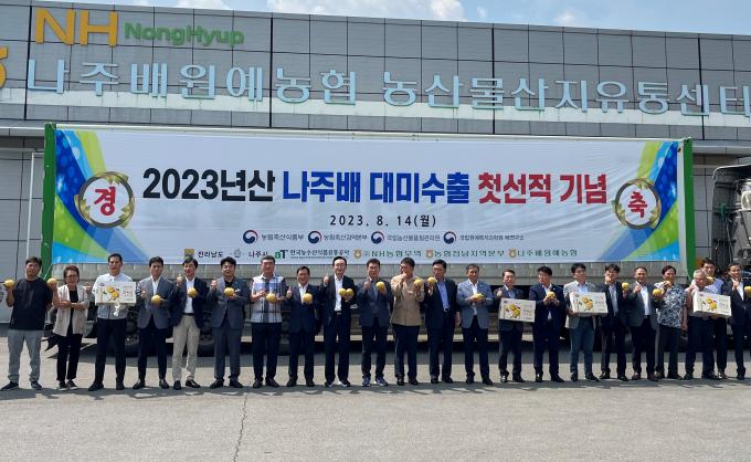 전라남도는 한국의 대표 과일 나주 햇배 140톤을 미국으로 수출하기 위한 수출 상차식이 14일 나주배원예농협 수출선과장에서 열렸다고 밝혔다.