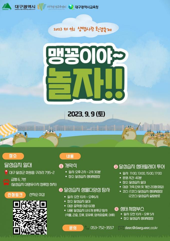16일 시에 따르면 올해 9회째를 맞는 생명사랑 환경축제는 시가 주최하고 (사)대구환경교육센터가 주관하며 대구시교육청이 후원하는 생태축제로 다양한 프로그램을 통해 습지의 중요성을 알리고 자연환경과 생명의 소중함을 느낄 수 있는 체험의 장을 마련할 예정이다.