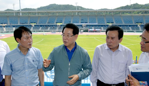 박 시장 "성공적 개최로 지역경제 활성화와 목포발전 계기" 당부 김영록 전라남도지사가 제104회 전국체전 개막을 50여 일 앞둔 19일 주 경기장인 목포종합경기장을 방문해 준비 상황을 점검했다.