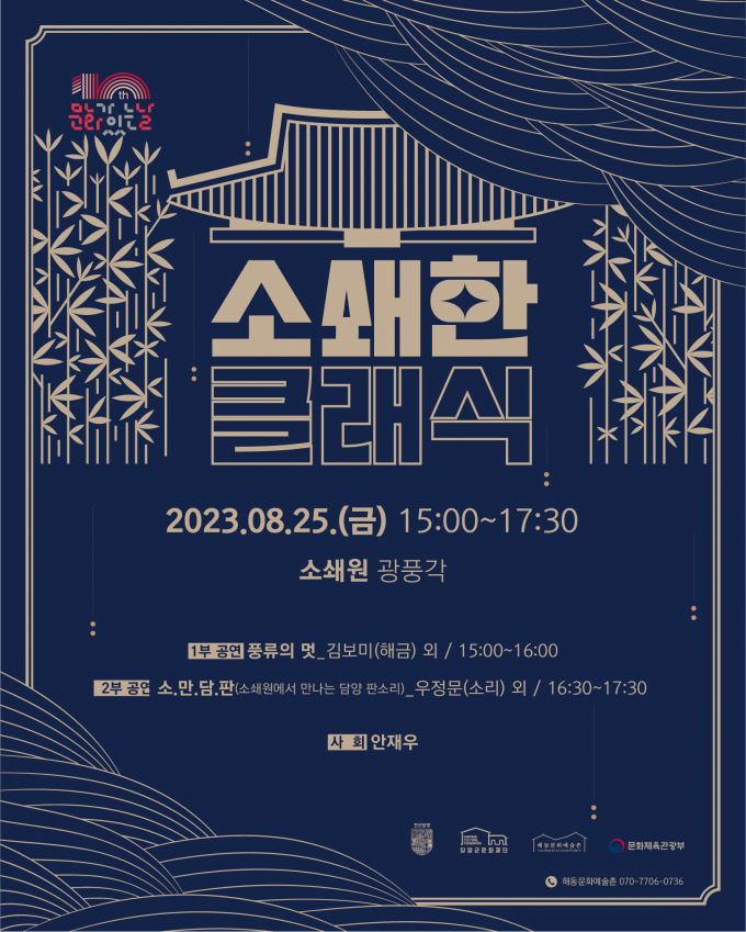 '소쇄한 클래식'은 전문공연예술인과 함께 전통문화 유산을 활용한 공연 프로그램으로 지금까지 국악과 클래식 두 차례의 공연을 진행했으며, 오는 25일 열리는 공연은 1부, 2부로 구성돼 우리 소리를 자연과 함께 감상하는 색다른 공연을 선보인다.