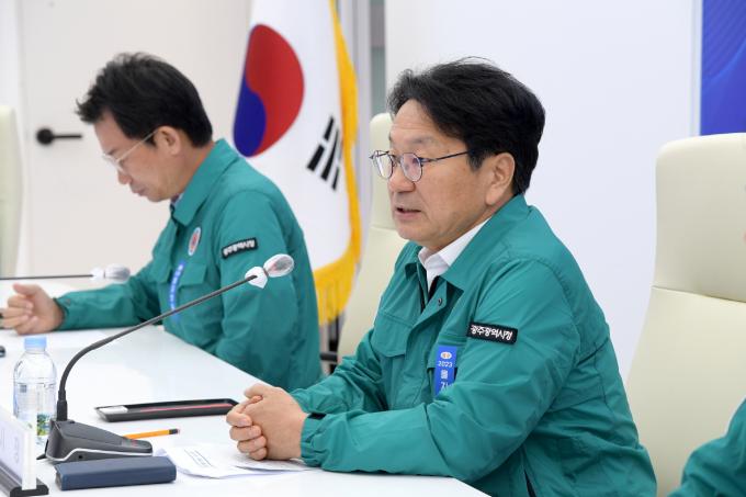 ▲강기정 광주광역시장이 21일 오전 시청 충무시설에서 열린 을지연습 최초상황보고회에 참석해 인사말을 하고 있다.  [광주광역시 제공]