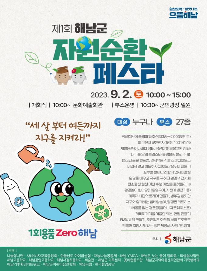 자원순환 관련 27종 교환·전시·홍보·체험 부스 운영 전남 해남군에서 다음달 2일 제1회 해남군 자원순환 페스타를 개최한다고 21일 밝혔다.