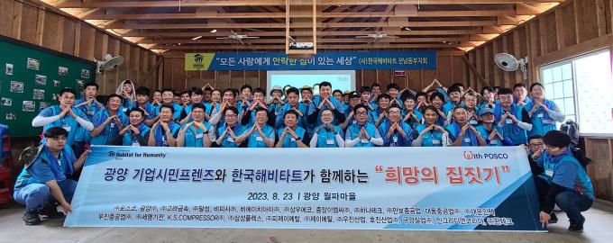 포스코 설비자재구매실, 원료실 임직원과 광양지역 우수 설비·자재·원료공급사 22개 기업 임직원 110여명은 주택에 필요한 문틀, 창틀, 지붕 트러스 등 목구조물 조립 봉사를 진행하며 함께 구슬땀을 흘렸다.