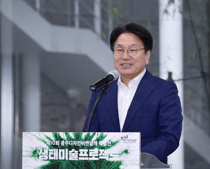 ▲강기정 광주광역시장이 24일 오후 광주시립미술관에서 열린 제10회 광주디자인비엔날레 특별전 '생태미술 프로젝트' 개막식에 참석해 인사말을 하고 있다. [광주광역시 제공]
