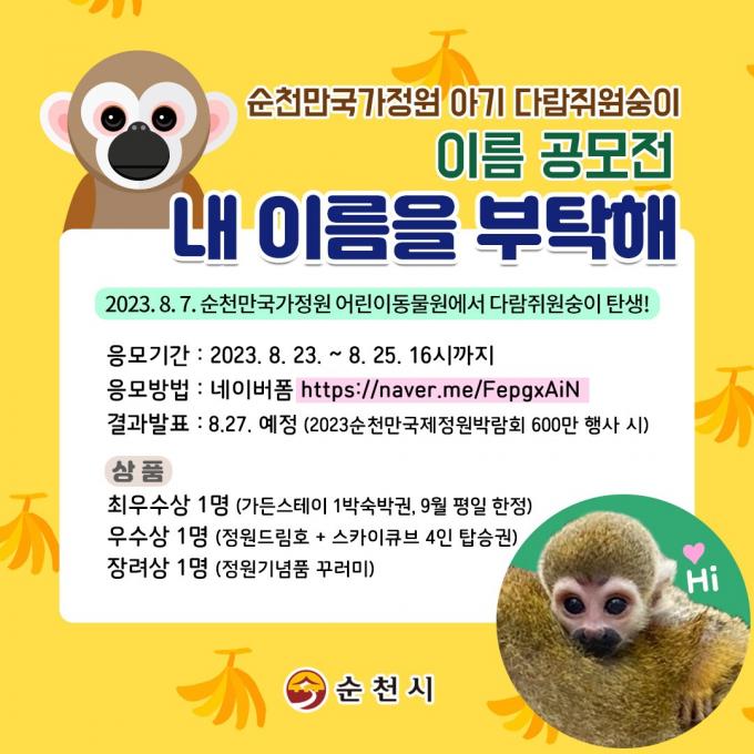 순천시는 어린이동물원 새 식구가 된 다람쥐원숭이의 출산이라는 기분 좋은 소식을 여러 사람과 함께하기 위해 이름 짓기 공모 이벤트를 진행한다.