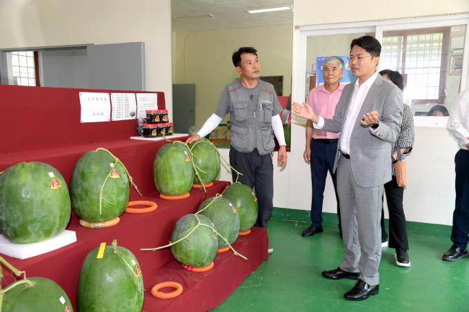 ▲김광진 광주광역시 문화경제부시장이 25일 오전 북구 금곡동 무등산수박 공동직판장을 방문해 농가 애로사항을 청취하고 있다. [광주광역시 제공]